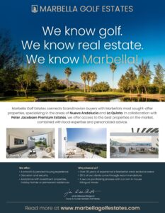 Marbella Golf Estates, in collaboration with Peter Jacobsen Premium Estates, specializes in the Scandinavian market. We connect buyers and investors with exclusive properties in Marbella, with a prime focus on Nueva Andalucía and La Quinta. By combining local expertise, personalized advice, and access to the finest properties on the market, along with in-house legal expertise, we ensure a smooth and seamless real estate experience.
